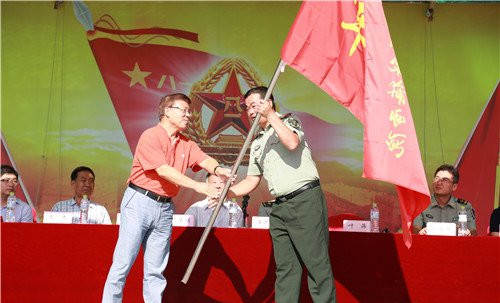 开营式在激昂的国歌中拉开帷幕。军训团作训部部长叶海同志宣读了军训团组成人员名单并从沈孝本副校长手中接过军训团团旗。